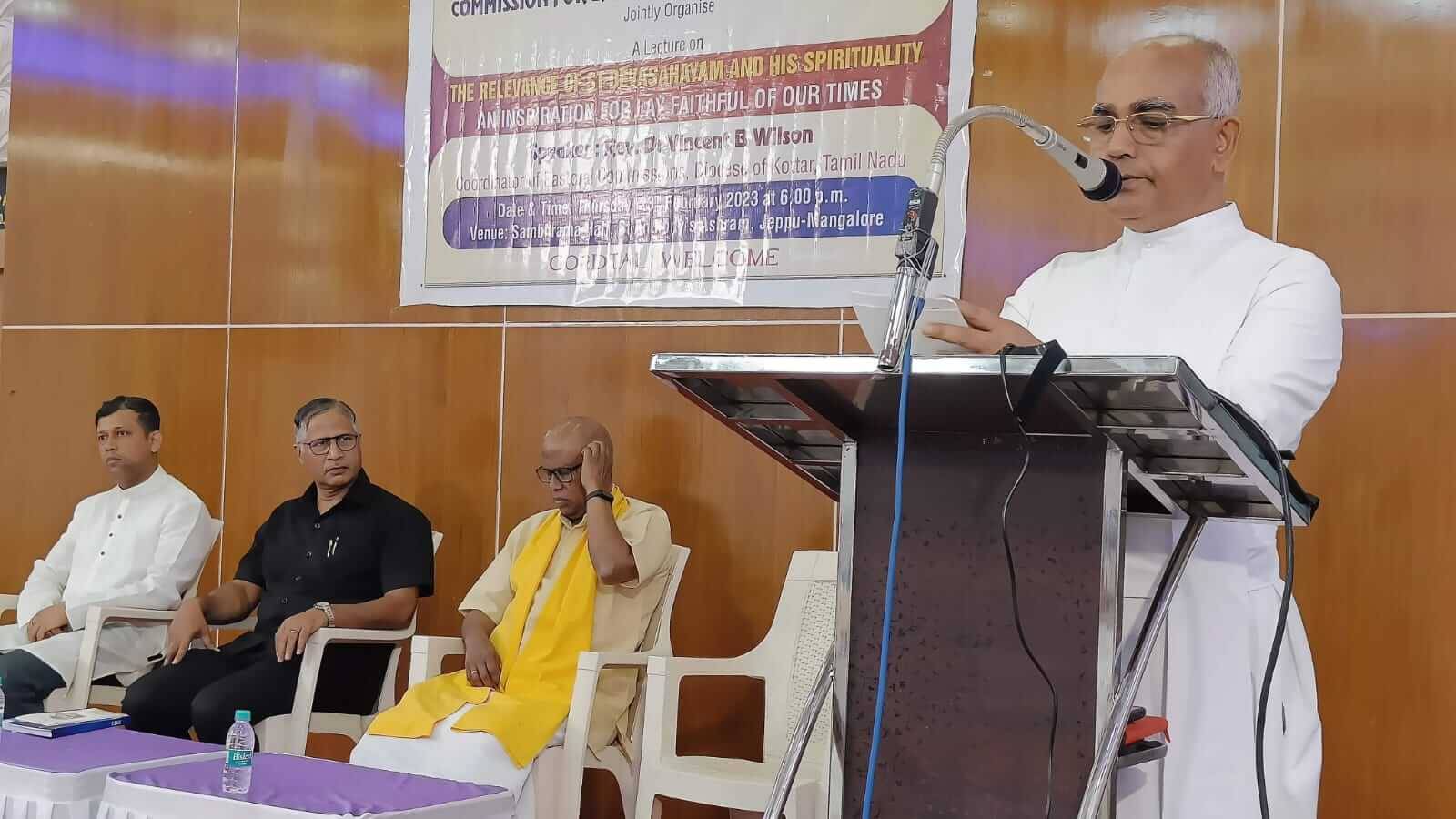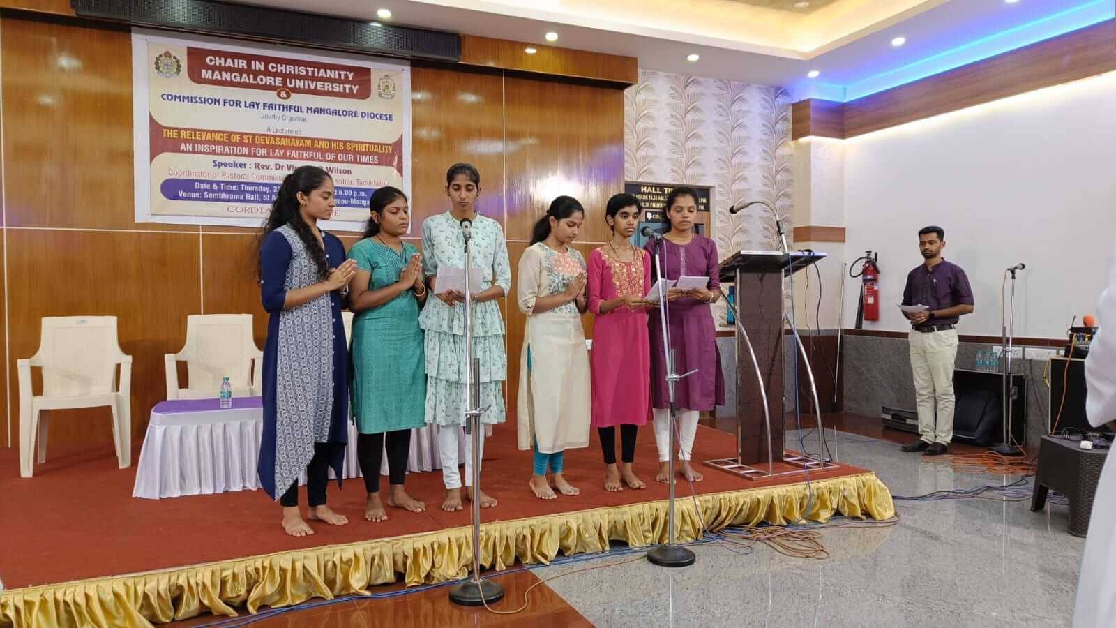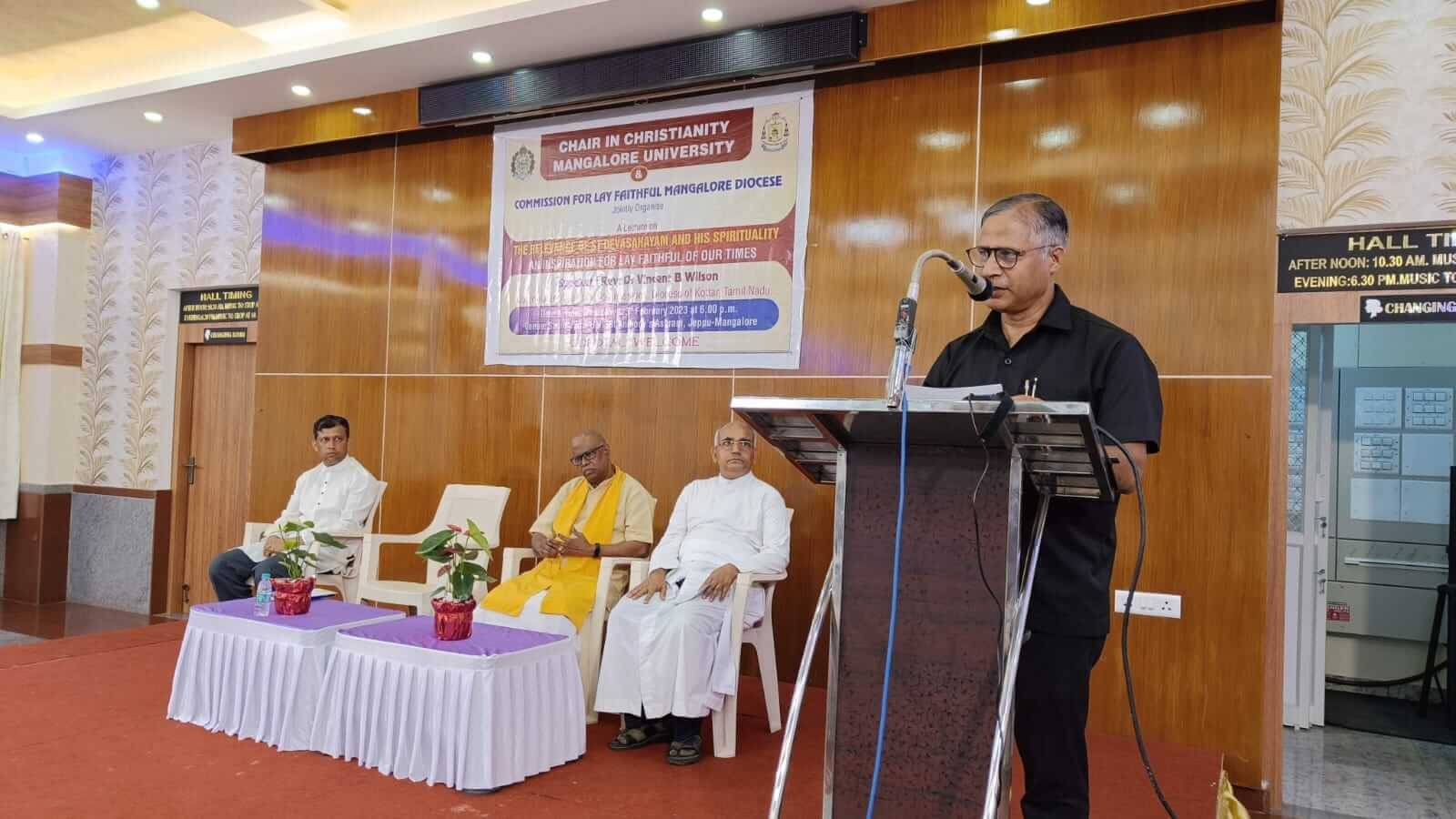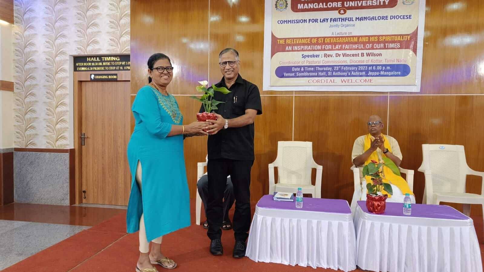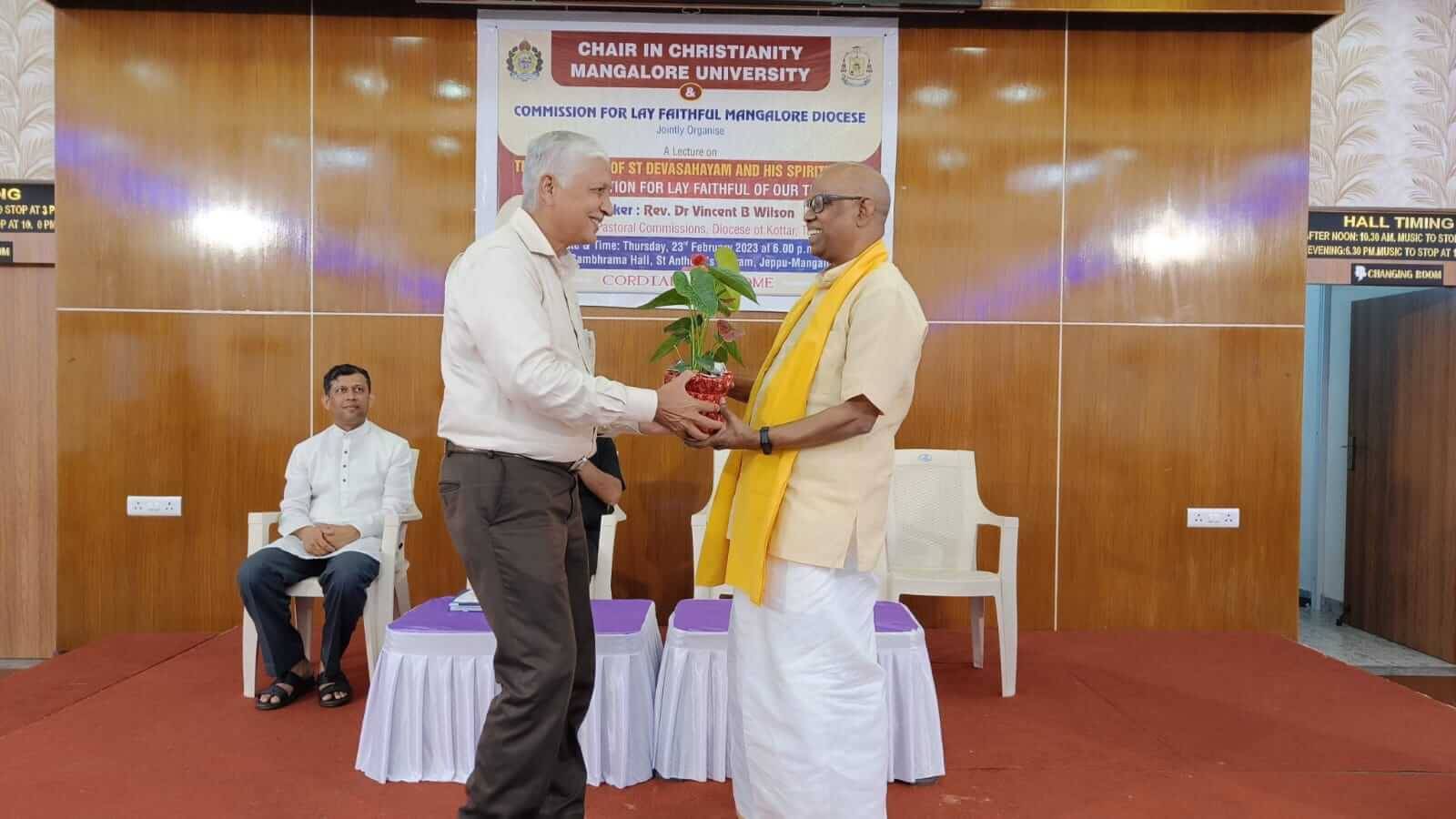 A lecture on “The Relevance of St Devasahayam and His Spirituality: An Inspiration for Lay Faithful of Our Times” was jointly organized by Chair in Christianity, Mangalore University and Commission for Lay Faithful, Mangalore Diocese on 23rd February 2023 at Sambhrama Hall, St Anthony’s Ashram, Jeppu-Mangalore. The speaker Rev. Dr Vincent B Wilson, Coordinator of Pastoral Commissions of Diocese of Kottar, Tamil Nadu narrated the life, socio-political background, context and mission of Devasahayam. He asserted that Devasahayam is a folk hero who identified himself with the oppressed class. The first Indian canonised lay martyr, opposed slavery and taxation in Tranvavore and considered all as children of God. He was ostracised by the people of higher caste and had to undergo many kinds of torture. The practice of secular spirituality made him a true witness of Christ. The speaker called the participants to critique the upper-class structure like Devasahayam, who inspires all to treat everyone with dignity and respect.